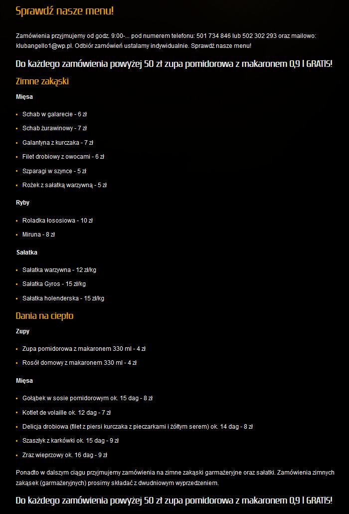 Sielankowy wieczór z międzynarodowym jedzeniem – serwujemy Wam świeżo przygotowane potrawy w przytulnej atmosferze. „Klub Angello” ma wszystko, czego dusza zapragnie – wspaniałe drinki, smaczne dania i super atmosferę. Poczuj się dobrze w każdą pogodę w naszych dobrze klimatyzowanych wnętrzach.
